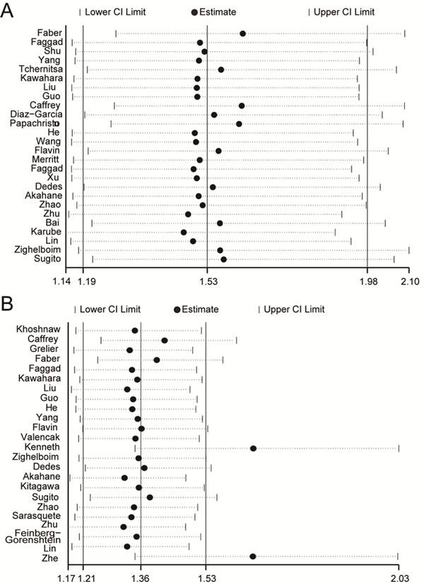 Figure 3: Sensitivity analysis. Pooled relative risk and 95% CIs by omitting each study. A. For OS group. B. For PFS group.
