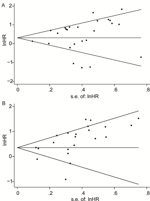 Figure 4: Funnel plots of the hazard ratios of cancer patients by the SE, for all studies included in the meta-analyses. Hazard ratios are displayed on a logarithmic scale. A. For the OS group, P = 0.708 for Begg’s test, and P = 0.216 for Egger’s test. B. For the PFS group, P = 0.309 for Begg’s test, and P = 0.000 for Egger’s test.