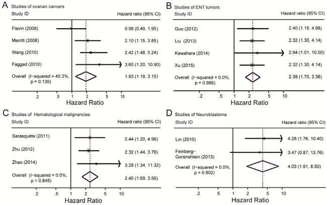 Figure 5: Summary hazard ratios and 95% confidence intervals (CIs) of cancer patients. Horizontal lines represent 95% CIs; diamonds represent summary estimates with corresponding 95% CIs. A. For ovarian cancer subgroup, I2 = 45.3%, P = 0.139. B. For ENT tumor subgroup, I2 = 0.0%, P = 0.986. C. For neuroblastoma subgroup, I2 = 0.0%, P = 0.802. D. For hematological malignancy subgroup, I2 = 0.0%, P = 0.845