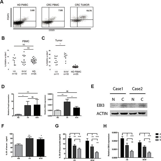Figure 1: Increased Treg numbers and IL-35 levels in patients with CRC. (A) Representative flow cytometric (FCM) dot plots showing Foxp3 and CD25 double-labeled CD4 T cells both in healthy donors (HD) and CRC patients. (B and C) Significantly increased proportions of Treg cells in CRC patients in early and advanced clinical stages compared to the proportions in healthy donors. (D) The mRNA expression levels of Treg-related transcription factors and the IL-35 subunit EBI3 in PBMCs. (E) Immunoblotting analyzed the EBI3 expression in normal (N) and cancer (C) tissue of patients with CRC. (F) Serum IL-35 concentrations of HD and CRC were detected by ELISA. (G) IL-35 concentrations in lysate supernatant of colorectal cancer (Dark Grey, C), adjacent (Black, A) and normal mucosal tissues (Light grey, N) were detected. (H) The mRNA expression levels of the IL-35 subunit EBI3 in PBMCs. Data represent the mean ± SEM. *p < 0.05, **p < 0.01, and ***p < 0.001 compared to the HD group.