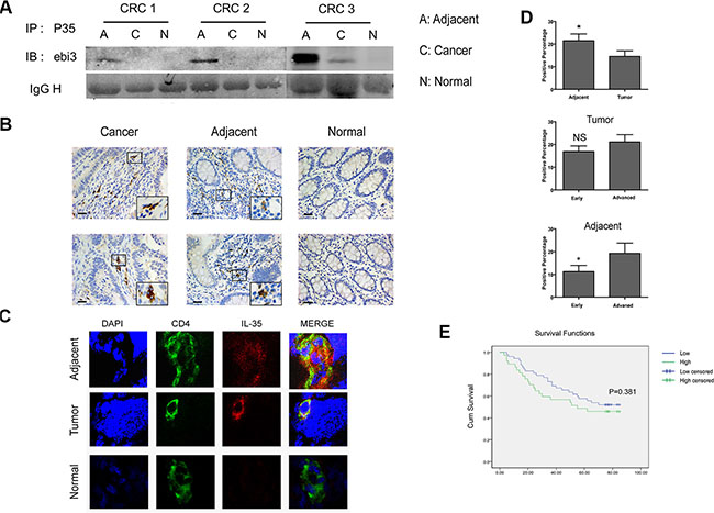 We applied immunoprecipitation, immuno- histochemistry and immunofluorescence assays to further analyze the expression and localization of heterodimeric cytokine IL-35. Tissue lysis was immunoprecipitated with anti-human IL-12A and detected using anti-human EBI3 antibodies. We found high levels of IL-35 expression in tumors and tumor-adjacent tissues (Figure 2A and Supplementary Figure S1C). IL-35-positive cells were primarily lymphocytes in both tumors and tumor-adjacent tissues (Figure 2B), and IL-35 was especially highly expressed in CD4+ T cells (Figure 2C). The staining score for IL-35 was higher in adjacent tissues than in the tumors themselves and was associated advanced clinical stage tumors (Figure 2D, P < 0.05). However, higher IL-35 expression was not significantly associated with reduced overall survival in patients at follow-ups (Figure 2E, P > 0.05). While, its expression in adjacent tissues was correlated with distant metastasis (P = 0.007) (Table 2). As expected, IL-35 was expressed in CRC, and it was significantly associated with tumor metastasis.