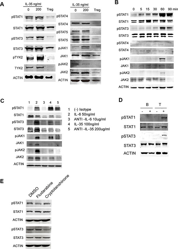 Figure 4: The signaling pathway activated in IL-35-stimulated T cells. (A) CD4+CD25− T and CD4+CD25+ Treg (1 × 105 per well) cells purified from HDs were activated using αCD3/CD28 with 200 ng/ml rhIL-35 or PBS. Total protein was extracted from cells collected on day 5 and analyzed to determine the levels of IL-12 family-related transcription factors using western blot analysis. (B) The phosphorylated and total levels of STAT1, STAT3, JAK1, and JAK2 were examined using immunoblotting assays immediately in 200 ng/ml rhIL-35-activated freshly isolated Pan T cells. (C) An IL-35 blockade was applied while the cells were activated with rhIL-35, as described. The phosphorylated and total expression levels of STAT1, STAT3, JAK1, and JAK2 were examined after 60 min. IL-6 blockade was used as the positive control. (D) The phosphorylated and total expression levels of STAT1 and STAT3 were examined in purified B and T cells using immunoblotting assays after they were rhIL-35-activated. (E) The phosphorylated and total expression levels of STAT1 and STAT3 were examined in PBMCs treated with fludarabine (STAT1 inhibitor, 10 μmol/ml) and cryptotanshinone (STAT3 inhibitor, 20 μmol/ml) and rhIL-35 together for 1 hr. The data shown are representative of three independent experiments.