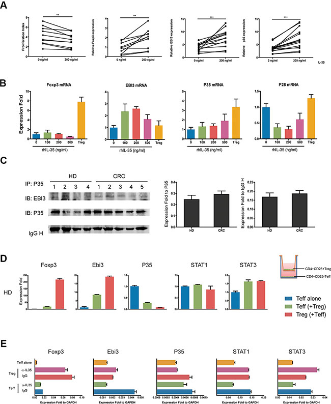 Figure 5: IL-35 production was increased through positive feedback. (A) CD4+CD25− T cells (1 × 105 per well) from HDs (N = 10) were incubated with rhIL-35 at a final concentration of 200 ng/ml. Cell proliferation and the expression of Foxp3, EBI3, and P35 mRNAs were observed on day 5. (B) CD4+CD25− T cells (1 × 105 per well) obtained from HDs were incubated in a series of concentrations of rhIL-35 for 5days, and the expression levels of Foxp3, EBI3, P35 and the IL-12 cytokine family-related subunit P28 mRNAs were analyzed. (C) IL-35 expression was analyzed in the culture supernatants of CD4+CD25− T cells stimulated with rhIL-35, confirmed following immunoprecipitation with anti-human IL-12A (P35) antibodies, and resolved using SDS-PAGE. The blots were then probed with monoclonal anti-human EBI3 and P35 antibodies. Scan image software detected the gray values of each EBI3, P35 and IgH protein bands. The values of EBI3 were normalized to P35 and IgH, respectively. (D) CD4+CD25- T cells (1 × 105 per well) obtained from HDs were co-cultured with autologous CD4+CD25+ T cells (5 × 104 per well) in transwell culture system (0.4 μm) for 5 days. The mRNA expression levels of Foxp3, EBI3 and P35 were observed. Blue bar, HD Teff control which co-cultured with autologous Teff; green bar, HD Teff which co-cultured with Treg; red bar, HD Treg which co-cultured with Teff. (E) IL-35-neutralizing antibodies were added to the coculture systems of CD4+CD25− T (1 × 105 per well) cells and autologous CD4+CD25+ T cells (5 × 104 per well) that were obtained from HDs. After 5 days, the mRNA expression levels of Foxp3, EBI3, P35, STAT1 and STAT3 were observed using Q-PCR. The data shown are representative of three independent experiments. The results are shown as the mean ± SEM. *p < 0.05.