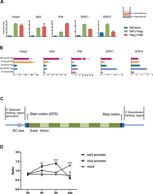 Figure 6: The transcriptional activity of the EBI3 promoter was induced by stimulation with IL-35. (A) CD4+CD25− Teff cells (1 × 105 per well) obtained from CRC patients were co-cultured with autologous CD4+CD25+ Treg cells (5 × 104 per well) in transwell culture system (0.4 μm) for 5 days. The mRNA expression levels of Foxp3, EBI3, and P35 were observed. Blue bar, HD Teff control which co-cultured with autologous Teff; green bar, HD Teff which co-cultured with Treg; red bar, HD Treg which co-cultured with Teff. (B) CD4+CD25− Teff cells (1 × 105 per well) obtained from HD were co-cultured with autologous CD4+CD25+ Treg cells or allogeneic Treg cells from CRC (5 × 104 per well) in transwell culture system (0.4 μm) for 5 days. Series mRNA expression levels were observed. Violet, CRC Treg which co-cultured with allogeneic Teff; orange, HD Treg which co-cultured with autologous Teff; dark green, HD Teff which co-cultured with autologous Treg; lavender, HD Teff which co-cultured with allogeneic Teff; pink, HD Teff control. (C) Schematic diagram showing the structure of the EBI3 gene. (D) An EBI3 promoter-containing fragment (bp −450 to +8 UTR) was ligated into the promoterless luciferase (luc+) vector pGL3 basic (Promega). The vectors containing the EBI3 promoter and the NF-κB promoter and the mock plasmids were transferred into human pan T cells using electroporation. After 4, 8 and 24 hours of incubation with 200 ng/ml IL-35, the transcriptional activity of each gene promoter was determined. The data shown are representative of the mean ± SEM. **p < 0.01, ***p < 0.001.