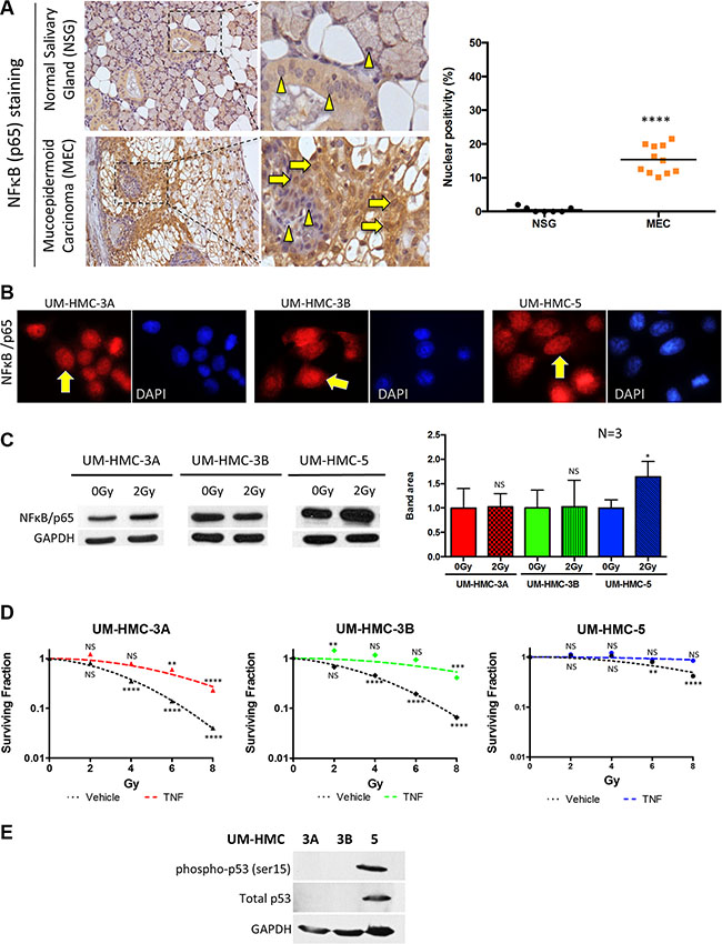 Figure 2: Activation of NFκB in MEC. (A) NFκB (p65) (yellow arrows) was significantly increased in the nucleus of MEC samples compared to normal salivary glands, which showed prevalent cytoplasmic staining (arrowhead) (***p < 0.001, n = 11, mean ± SD). (B) Immunofluorescence of UM-HMC-3A, UM-HMC-3B, and UM-HMC-5 tumor cell lines depict the presence of nuclear NFκB (yellow arrows). (C) UM-HMC-3A, UM-HMC-3B, and UM-HMC-5 show detectable NFκB (p65) protein levels at baseline (0 Gy). NFκB is increased in UM-HMC-5 following 2 Gy of IR (*p < 0.05, mean ± SD from experiments run in triplicate). (D) Clonogenic assay for MEC cells with no stimuli or TNF-α stimuli revealed that NFκB upregulation significantly increases the resistance of UM-HMC-3A and UM-HMC-3B (**p < 0.01, ***p < 0.001, n = 3, mean ± SD compared to 0 Gy). (E) Western blot of UM-HMC-3A, UM-HMC-3B, and UM-HMC-5 for phosphorylated p53 (ser15) depict high expression of the p53 protein on UM-HMC-5 cells. UM-HMC-3A and 3B are absent of p53 protein levels.