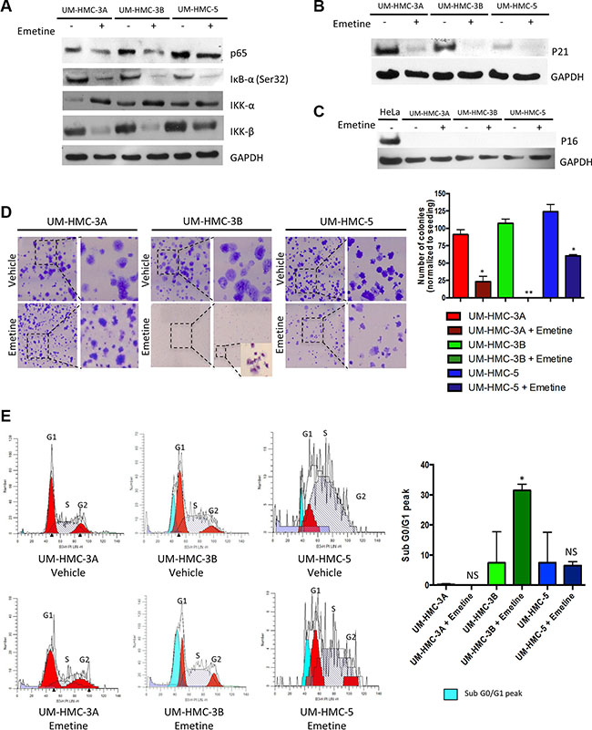 Figure 3: Emetine induces inhibition of the IKK-β/IκB-α/NFκB axis and induces apoptosis of UM-HMC-3B. (A) Down-regulation of NFκB expression in MEC cells after Emetine treatment for 24 hrs was confirmed by Western blot analysis. Emetine inhibited IκB-α (Ser32) and IKK-β phosphorylation but did not affect the IKK-α subunit. (B) Emetine treatment for 24 hrs lead to p21 inhibition, and (C) had no effect on p16. (D) Emetine disrupted the colony forming potential of MEC cells. UM-HMC-3A and UM-HMC-5 treated for 24 hrs with Emetine had a significantly smaller number of colonies after 7 days in culture while UM-HMC-3B did not have colonies larger than 50 cells. (E) Emetine causes cell cycle arrest at the sub G0/G1 checkpoint in UM-HMC-3B cells (*p < 0.05).
