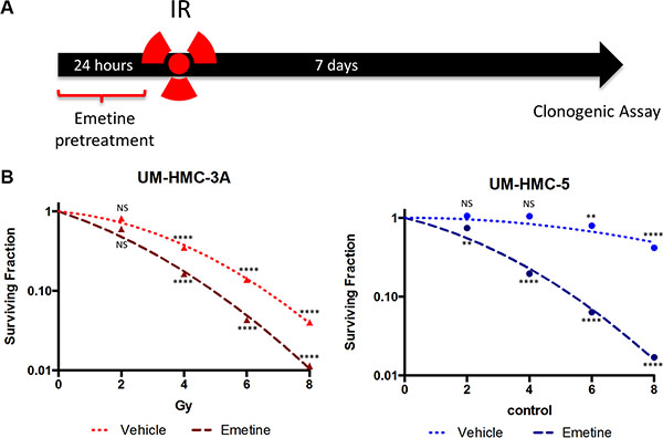 Figure 4: Pharmacological inhibition of NFκB sensitizes MEC cells to IR. (A) Cells were sensitized with Emetine for 24 hrs before IR. The drug was removed before IR exposure, and the clonogenic assay was performed after 7 days. (B) Survival was significantly decreased in UM-HMC-3A and UM-HMC-5 sensitized with Emetine compared to vehicle (n = 3, mean ± S, D compared to 0 Gy).
