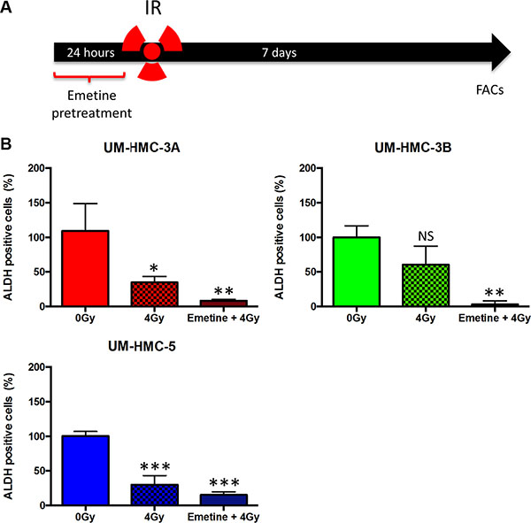 Figure 5: A combination of NFκB inhibition and IR efficiently deplete CSCs. (A) Cells were sensitized with Emetine for 24 hrs; Emetine was removed from the media before IR. Cells were collected and processed for ALDH enzymatic activity using fluorescence-activated cell sorting (FACS). (B) A combination of NFκB inhibition and IR leads to enhanced depletion of CSCs in MEC cell lines compared to radiation alone (n = 3, mean ± SD).