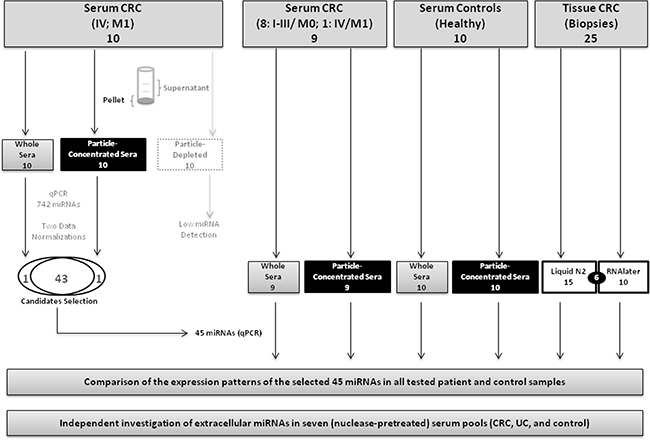 The strategy of our study to identify CRC-related miRNA biomarkers in the blood is depicted in Figure 1. A general focus was laid on the possible impact of a robust and easy-to-perform pre-analytic concentration of miRNA-carrying particles in favor of an improved detection of CRC-specific miRNA signatures in the blood. Comparison of the detectability of 742 miRNAs in 30 RNA preparations from different serum fractions (Figure 1) of 10 CRC patients (UICC stage IV, compare Supplementary Table S2a) was performed on Exiqon miRCURY LNATM Universal RT miRNA PCR Human panels-I-and-II and revealed substantial differences depending on the pre-analytic processing of the sera. The total number of detected miRNAs was higher in the particle-concentrated fractions, than in the whole sera and corresponding particle-depleted fractions (~150-250, ~80-120, and ~20-50 miRNAs, respectively) (Supplementary Figure S1).