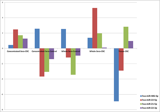 Our results suggest a possible “strand-specific” differential expression of extracellular miRNAs in CRC. For instance, both miR-22-3p and miR-22-5p were increased in paired CRC whole- and particle-concentrated sera, with a three-fold higher elevation of miR-22-5p than miR-22-3p in the respective enriched fractions than in whole sera (Table 1; Supplementary Table S3). Yet, a different scenario emerged in tumor tissues, which showed an elevation of miR-22-3p and down-regulation of miR-22-5p. ANOVA analysis (Supplementary Table S7; Figure 3) showed more concordance of expression patterns of miR-22-3p in the matched cancer particle-concentrated sera and tissues. These expression differences suggest an oncogenic role of miR-22-3p and a tumor suppressor function of miR-22-5p. Indeed, more relations to diseases (27 [including CRC] vs. two [hepatitis-B, prostate cancer]) and potential target genes (430 vs. 186) have been documented for miR-22-3p than of miR-22-5p (miRSearch v3: www.exiqon.com/miRSearch). miR-22 is known as a tumor suppressor in lung [41] and colon cancer [42], but it is unclear which mature form is most relevant. Down-regulation of miR-22 has been shown in CRC tissue and correlated with liver metastasis [43]. Deregulation of miR-22 has also been observed in tissues with IBD [44]. Remarkably, miR-22 is not expressed by blood cells [15]. Altogether, these data suggest that the abundance of miR-22 in the circulation may originate from the diseased (colon) tissue. The second candidate is miR-21. While miR-21-5p was overexpressed in CRC particle-concentrated sera and tissues, miR-21-3p was not detectable (Table 1; Figure 3). Previous studies also showed association of miR-21-5p expression with 134 diseases, including CRC (miRSearch v3).