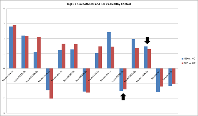 Figure 4: Consistent differential expression of 14 miRNAs in EV-Enriched sera fractions of both CRC and IBD. This figure demonstrates consistent overexpression of nine miRNAs and low expression of five miRNAs revealed in nuclease pre-treated, EV-enriched serum pools of CRC and IBD compared to a healthy control pool. The black arrows point to the elevated expression of miR-125b-5p and reduced expression of miR-146a.