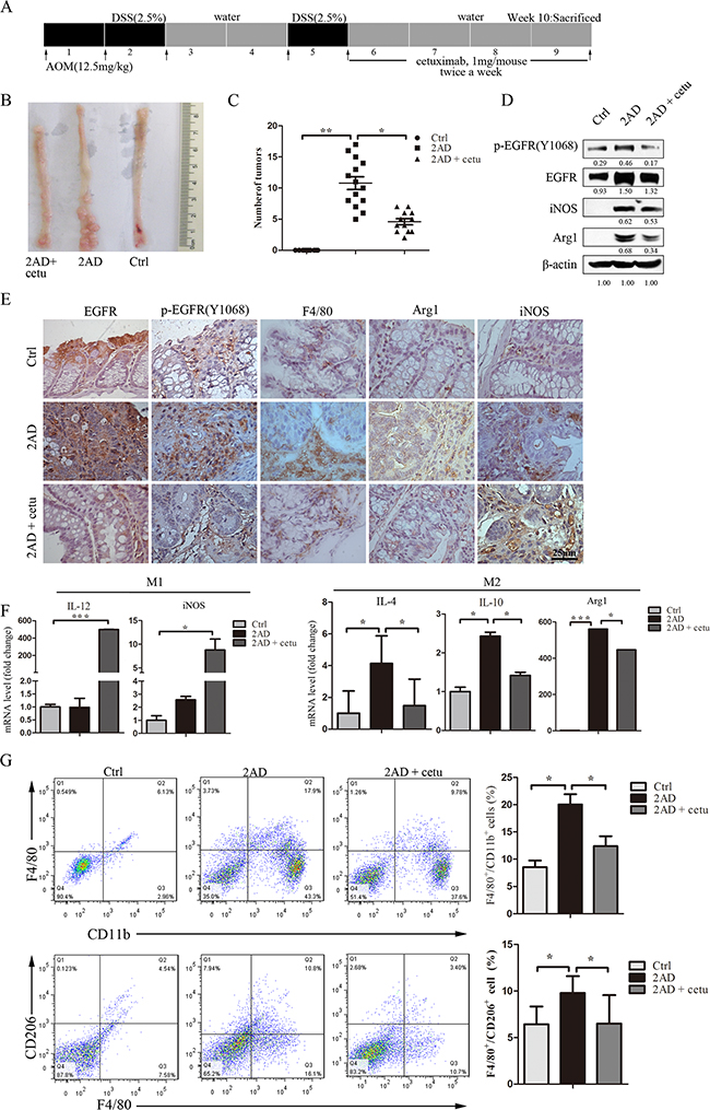 Figure 1: Cetuximab modulates macrophage polarization in an AOM/DSS mouse model. A. Establishment of the AOM/DSS mouse model. AOM was injected intraperitoneally at 12.5 mg/kg body weight. After one week, mice were given drinking water containing 2.5% DSS for 5 days followed by 16 days of regular drinking water. After two cycles of DSS treatment, cetuximab (1 mg/mouse, twice a week) was injected intraperitoneally for a month, and the mice were then sacrificed. B. Representative images of colon tumors in normal (right), AOM/DSS (2AD) (middle), and cetuximab-treated AOM/DSS mice (2AD+cetu) (left). C. Tumor quantification. Cetuximab treatment (2AD + cetu) reduced tumor numbers compared to 2AD mice. D. p-EGFR (Y1068), EGFR, Arg1, and iNOS protein levels in normal mice, 2AD and 2AD+cetu mouse tumors were detected by Western blot. All experiments were repeated three times. E. Representative photomicrographs of immunostaining for p-EGFR (Y1068), PCNA, F4/80, Arg1, and iNOS. Scale bars: 25 μm. F. M1 marker (IL-12, iNOS) and M2 marker (IL-4, IL-10, Arg1) mRNA levels in normal mouse colon tissues, 2AD and 2AD+cetu mouse tumor tissues were evaluated by q-PCR. G. Percentages of CD11b+/F4/80+ and F4/80+/CD206+ cells in normal, 2AD, and 2AD+cetu mice colon tissues were detected by flow cytometry. Colon tissues were cut into small pieces (1-2 mm) and incubated with collagenase D (1- mg/mL), dispase II (1 mg/mL), and DNase I (100 μg/mL) for 30-45 min in a shaking incubator at 37°C, and single-cell suspensions were then incubated with antibodies. Bars represent means ± SD (n = 3) for each treatment. *p < 0.05; **p < 0.01; ***p < 0.001.