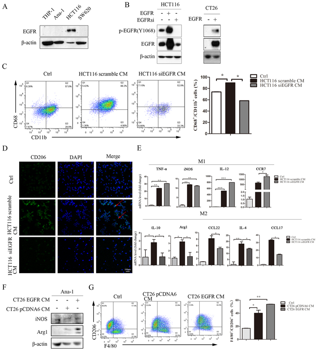 Figure 2: Inhibition of the EGFR signaling pathway in colon cancer cells prevents conditioned medium-induced M2-like macrophage polarization. A. EGFR protein levels in THP-1, Ana-1, HCT116, and SW620 cells were detected by Western blot. B. HCT116 cells were cultured to 50% confluence and then transfected with human scramble siRNA, pCDNA6-EGFR WT plasmid, or EGFR siRNA. CT26 cells were cultured to 50% confluence and then transfected with human pCDNA6 vector or pCDNA6-EGFR WT plasmid for 48 h; the cells were then harvested for Western blots for EFGR. C. Percentages of CD68+/CD11b+ in THP-1 cells after 48 h of treatment with normal RPMI1640, HC116 scramble CM, or HCT116 siEGFR CM were detected by flow-cytometry. D. Immunofluorescent staining for CD206+ was measured in THP-1 cells after incubation with normal RPMI1640, HCT116 scramble CM, or HCT116 siEGFR CM. E. M1-related marker (TNF-α, iNOS, IL-12 and CCR7) and M2-related marker (IL-4, CCL17, CCL22, IL-10 and Arg1) mRNA levels were detected by q-PCR in THP-1 cells after incubation with normal RPMI1640, HCT116 scramble CM, or HCT116 siEGFR CM. Scale bars: 100 μm. F. Arg1 and iNOS protein levels in Ana-1 cells were detected by Western blot after incubation with CT26 pCDNA6 CM or CT26 EGFR CM. G. Percentages of F4/80+/CD206+ in Ana-1 cells after incubation with CT26 pCDNA6 CM or CT26 EGFR CM were detected by flow cytometry. Red arrows indicate CD206 expression in the cell membrane. Nuclei were counterstained with DAPI. Bars represent means ± SD (n = 3) for each treatment.*p < 0.05; **p < 0.01; ***p < 0.001.