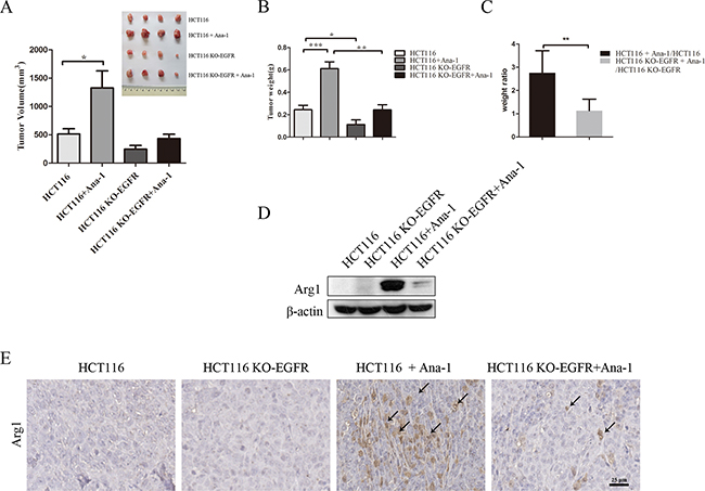 Figure 3: EGFR knockout in colon cancer cells inhibits macrophage-induced promotion of xenograft tumor growth. A. Mouse tumor volume quantification (bottom left). Images (top right) of tumors resulting from subcutaneous injection of HCT116 cells alone, HCT116 plus Ana-1 cells, HCT116 KO-EGFR cells alone, and HCT116 KO-EGFR plus Ana-1 cells (n=4) into Balb/c nude mice. After 18 days, the mice were sacrificed and tumors were excised. The experiment was repeated twice. B. Mouse tumor weights were measured. C. Weight ratio of mice receiving HCT116 plus Ana-1/HCT116 injections compared to HCT116 KO-EGFR plus Ana-1/HCT116 KO-EGFR injections. D. Arg1 protein levels were detected by Western blot in HCT116, HCT116 KO-EGFR, HCT116 plus Ana-1, and HCT116 KO-EGFR plus Ana-1 mouse tumors. E. Immunostaining for Arg1 in xenograft mouse tumor tissues. Scale bars: 50 μm. Bars represent means ± SD (n = 3) for each treatment. *p < 0.05; **p < 0.01.