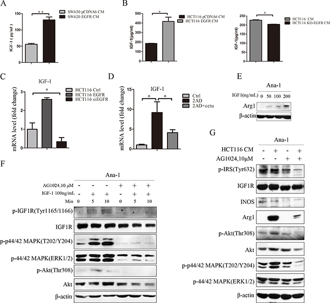 Figure 4: Colon cancer-derived IGF-1 promotes M2-like macrophage polarization. A. IGF-1 concentrations were determined by ELISA in SW620 and SW620 EGFR cell culture media. SW620 cells were cultured to 50% confluence and then transfected with human pCDNA6 vector or pCDNA6-EGFR WT plasmid. After 24 h, cells were transferred to normal medium and cultured for an additional 24 h. Conditioned medium from SW620 cells was collected, centrifuged at 3000 rpm for 10 minutes, and stored at -80°C until use. B. IGF-1 concentrations in HCT116 and HCT116 EGFR (left) and HCT116 and HCT116 KO-EGFR (right) cell culture media were measured by ELISA. C. IGF-1 mRNA levels in HCT116, HCT116 EGFR, and HCT116 siEGFR cells were measured by q-PCR. D. IGF-1 mRNA levels in normal, 2AD, and 2AD+cetu mouse tissues were measured by q-PCR. E. Arg1 protein levels were detected by Western blot in Ana-1 macrophages after treatment with mouse recombinant IGF1 (0, 50, 100, or 200 ng/mL) for 48 h. F. Levels of IGF1R signaling pathway-related proteins were detected by Western blot. Ana-1 cells were harvested after treatment with 100 ng/mL mouse recombinant IGF-1 for 5 or 10 min, or after pretreatment with AG1024 for 30 min followed by 100 ng/mL mouse recombinant IGF-1 for 5 or 10 min. G. Protein levels were detected by Western blot in Ana-1 cells. Ana-1 cells were pretreated with AG1024 for 30 min, and medium was then replaced with fresh RPMI 1640 with AG1024 (10 mM) or HCT116 CM with AG1024 (10 mM) followed by an additional 48 h of culture. Cells were harvested and levels of Arg1, iNOS, and IGF1R signaling pathway-related proteins p-IRS(Tyr632), IGF1R, p-p44/42 MAPK(T202/Y204), p-44/42 MAPK(Erk1/2), p-Akt(Thr308), and Akt were measured by Western blot. Bars represent means ± SD (n = 3) for each treatment. *p < 0.05; **p < 0.01.