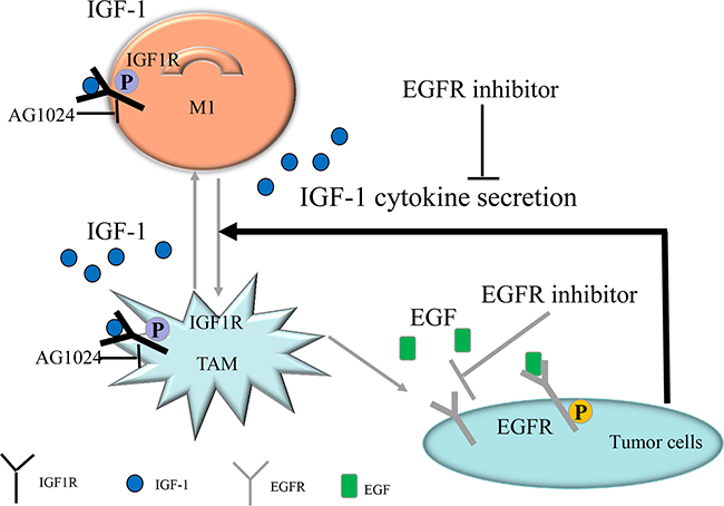 In conclusion, our results suggest that inhibition of the EGFR signaling pathway in colon cancer cells alters cytokine secretion (e.g. IGF-1) and prevents M1- to M2-like polarization in macrophages, thus inhibiting cancer cell growth (Figure 5). Inhibiting such macrophage polarization might be a promising novel method for treating cancer.