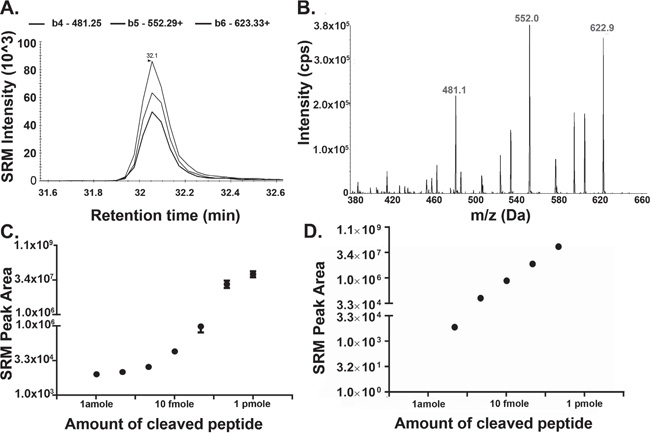 Next, steps were taken to ensure non-specific proteolytic digestion of the peptide was avoided. Villanueva et. al. demonstrated that proteolytic digestion is inhibited at the non-naturally occurring D-isoform of an amino acid [24]. By capping both ends of the target peptide with a stretch of three D-amino acids, the effect of exopeptidases on the target synthetic peptide would be minimized (represented in lower case, Figure 1B). In the first instance the peptide was capped at each end with amino acid sequences hpv, hav or hph. Histidine residues were selected as they can sequester positive charge in electrospray ionisation, which should aid in detecting the cleaved forms of the target peptide in the SRM analyses. In silico analysis of the amino acid sequences of the peptides, hphFAAN, hpvFAAN, havFAAN, DVSKhph, DVSKvph and DVSKvah indicated that none of these product peptides, generated upon cleavage of synthetic substrate, are found endogenously in humans.