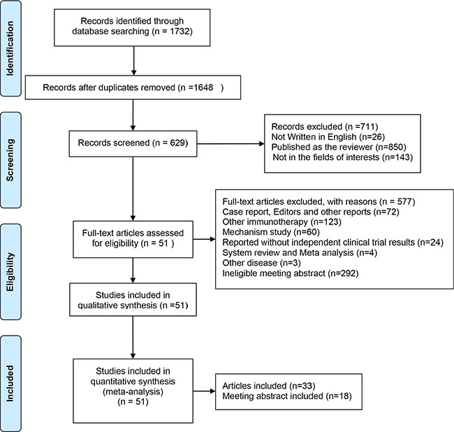 The eligible studies were limited to human clinical trials published in English. Studies were included if they performed clinical trials with anti-PD-1/PD-L1 antibodies for advanced or refractory cancer patients, reporting either the efficiency or safety. Meeting abstracts in the EMBA database from ASCO (www.asco.org) and ESMO (www.esmo.org) published in the last two years were also included. When part or all of the patients were involved in more than one publication, only the most complete or most informative study was included in this analysis.