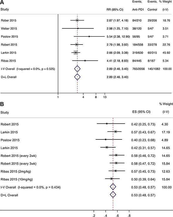 Figure 2: Forest plot for ratio risk and confidence intervals of response rate (A) and PFS survival (B) of anti-PD-1 antibody compared with other therapies for melanoma.