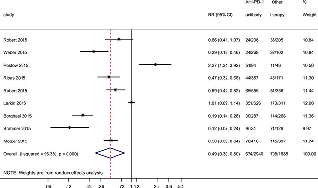 We also compared the adverse effect rates of Nivolumab and Pembrolizumab with other therapies including chemotherapy and anti-CTLA4 antibody (clinical data showed in Supplementary Table S1). Meta-analysis showed that the anti-PD-1 antibody was associated with a significant decrease in adverse effect rate compared with other therapies (RR = 0.49, 95% CI: 0.30–0.80, P = 0.004), with large heterogeneity (I2 = 95.3, χ2 = 171.02, P < 0.001) (Figure 3). Egger’s regression asymmetry test (P = 0.415) and Begg’s test (P = 0.754) showed no evidence of substantial publication bias. Compared to 376 out of 1000 patients having adverse events in the group with other therapies, only 184 out of 1000 had adverse events with the anti-PD-1 antibody. Based on a rate of 37.6% in the group with other therapies, the NNTB would be 5. Compared to the group with other therapies, the number of adverse cases was reduced by 192 per 1000 individuals with the PD-1 antibody. Meta-regression analysis showed that Nivolumab/Ipilimumab combination was significantly positively associated with adverse effect rate (P= 0.022, Supplementary Table S3). Subgroup analysis also showed that Nivolumab/Ipilimumab combination increased adverse effects (RR = 1.45, 95% CI: 0.65–3.24), but did not reach statistical significance.