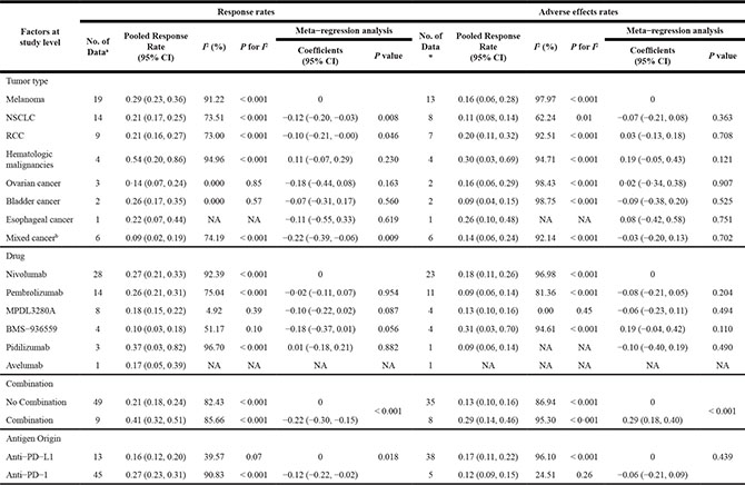 Table 1: Meta-regression analysis for response rates and adverse effect rates of anti-PD-1/PD-L1 antibodies in cancers