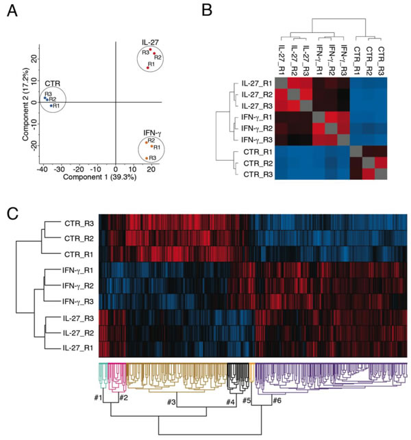 Figure 1: Principal component analysis, Pearson’s correlogram and unsupervised hierarchical clustering analysis of untreated, IFN-γ-or IL-27-treated SKOV3 cells. A. Two-dimensional scatter plot of the principal component analysis of SKOV3 Untreated (blue), IFN-γ- (orange) and IL-27-treated (red dots) samples.B. The Pearson’s correlogram depicts the coefficient values in a pseudo-color scale, which extends from 0.1 (light blue) to 0.9 (red). The dendrogram displays the results of an unsupervised hierarchical-clustering analysis placing similar Pearson’s coefficient values near each other. All the samples cluster according to treatment.C. Unsupervised hierarchical-clustered heatmap of 990 proteins identified by Multiple-samples test ANOVA performed on the SKOV3 cell line. The amount of each protein in individual samples is represented by the color scheme in which red and blue indicate high and low expression of proteins, respectively. Three independent biological replicates of cells treated with IL-27 or IFN-γ or left untreated (CTR) are shown. Proteins are clustered into 6 groups according to their expression value. Cluster #3 and cluster #6 represent a concordant modulation by IFN-γ and IL-27 treatments. In particular, 489 were up-regulated in cluster #6 and 325 were down-regulated in cluster #3 by both cytokines. A smaller number of proteins (176) was differentially modulated by the two cytokines and clustered into 4 small groups, relative to untreated cells.