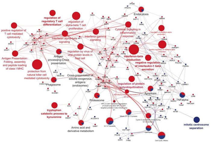 Figure 3: Functional networks of IL-27-modulated proteins in SKOV3 cells. The network was obtained from proteins showing significant (t-test) variations between IL-27 treatment and control. The network was built through the merge between a first network obtained according to ClueGO setup and a second one built by GENEMANIA app. Each big node represents a Gene Ontology Biological Process term or a Reactome pathway, while the small node represents query proteins used for the analysis from which previous terms are obtained. The node size represents the P value obtained from two-side hypergeometric test corrected by the Bonferroni step-down method. The protein expression is represented by the color scheme in which red and blue indicate high and low expression of proteins. The same colors are used for the node terms in which the pie represents the percentage of protein up or down regulated.