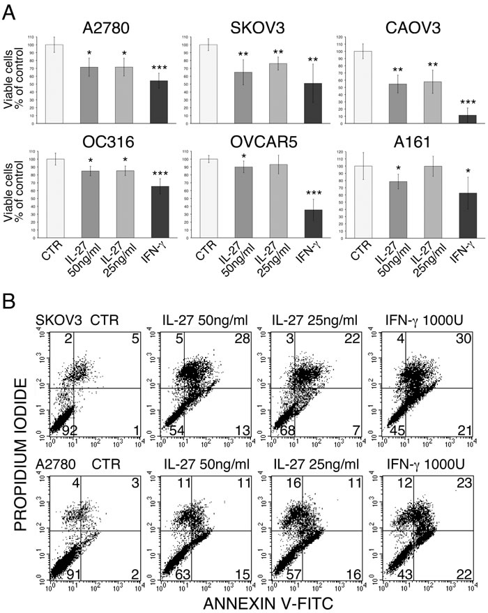 Figure 4: Anti-proliferative and pro-apoptotic effects of IL-27 on human ovarian cancer cell lines. A. The proliferation and cell viability was evaluated using a standard MTT assay. Data are expressed as % of untreated control and are the mean±SD of six replicates. The experiment is representative of at least three independent ones showing consistent results. * 5E-5 < P < 0.05; **1E-7 < P < 5E-5; *** P < 1E-7. B. Apoptosis was measured by an Annexin V-FITC/PI staining and flow-cytometric analysis. Numbers indicate the % of cells in the relative quadrant (lower left: viable cells; lower right: early apoptotic; upper right: apoptotic; upper left: post-apoptotic cells). An experiment representative of three with consistent data is shown for two cell lines.