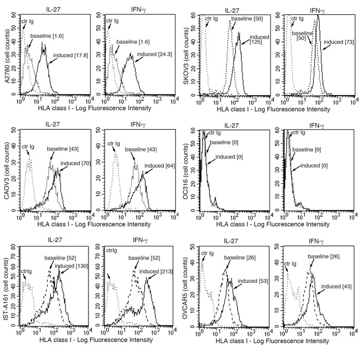 Figure 5: IL-27 increases HLA class I membrane expression in human ovarian cancer cells in vitro. FACS analysis of surface HLA class I expression in five ovarian cancer cell lines and one primary culture (IST-A161, passage 15) of serous ovarian carcinoma cells from ascites, cultured in the presence of medium (baseline), IL-27 or IFN-γ (induced). Isotype-matched unrelated Ig staining control is indicated (ctrIg). Numbers in brackets are Median Fluorescence Intensity (MFI) values calculated as median HLA class I (W6/32 mAb) minus median Ig control.