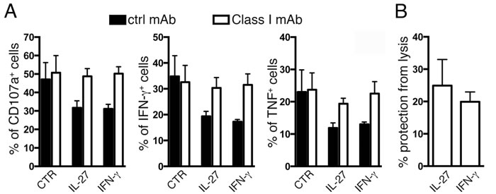 To verify whether IL-27 up-regulation of surface HLA class I may result in biological effects, we tested whether it may affect NK cell recognition as suggested by pathway analysis. It is well known that HLA class I alleles inhibit NK cell activation through the engagement of their killer immunoglobulin-like receptors (KIRs) [35]. As shown in Figure 7, IL-27 or IFN-γ pre-treatment of A2780 cells resulted in inhibition of NK cell degranulation (CD107a) and cytokine (IFN-γ or TNF) production, as compared to untreated A2780 cells (Figure 7A). Also, NK cytolytic activity was reduced by 24±8 or 20±3% following IL-27 or IFN-γ treatment, respectively (Figure 7B). Masking of HLA class I through an IgM anti-HLA class I antibody completely reverted these effects (Figure 7A).