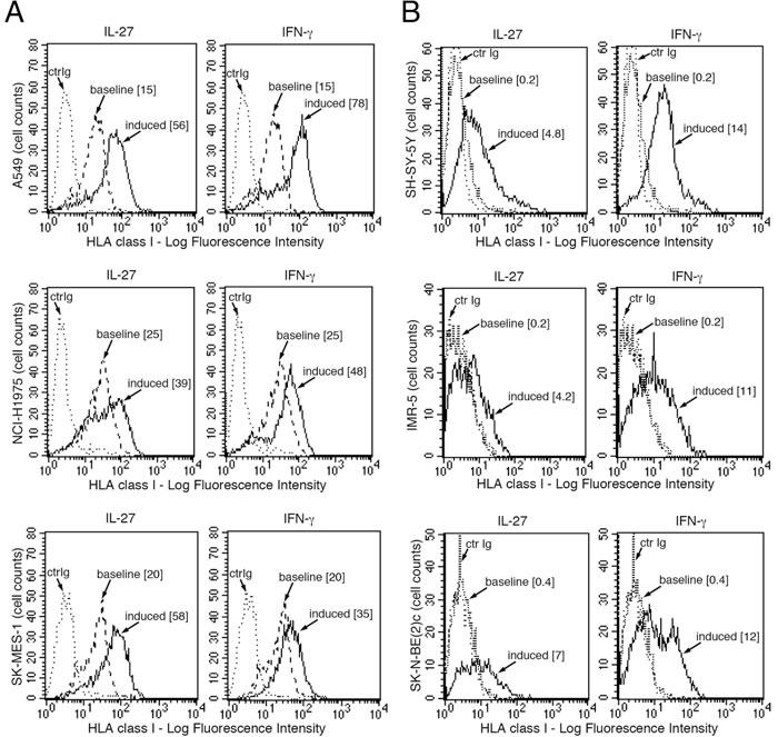 We then asked whether IL-27 could up-regulate HLA class I expression also on other human cancer cells including three non-small cell lung cancer (NSCLC) and three human neuroblastoma (NB) cell lines. NB cells seemed of particular interest as they frequently display an HLA class Ilow phenotype due to low expression of different APM components [36]. As shown in Figure 8, IL-27 up-regulated HLA class I expression in the lung cancer cell lines analyzed and induced de novo expression in NB cells such as the SH-SY-5Y cell line.