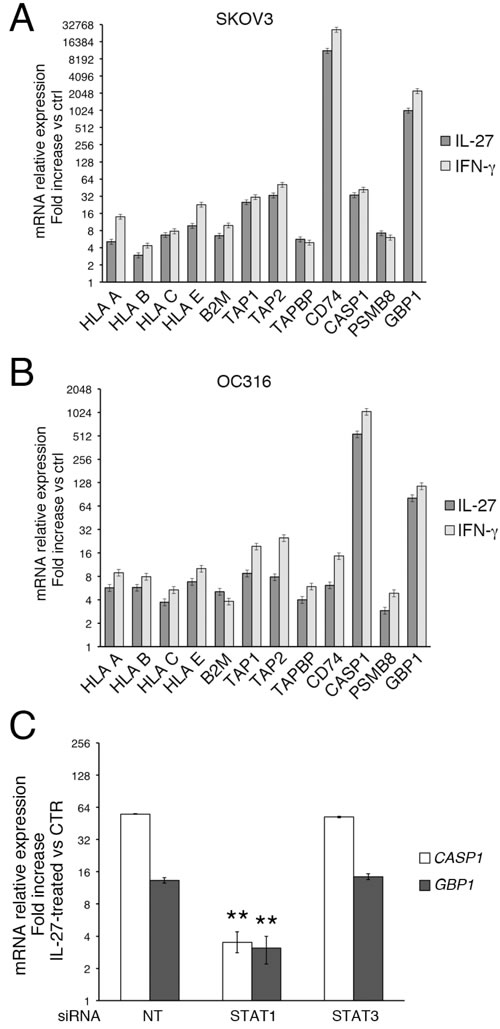 Figure 9: IL-27 increases mRNA expression of representative genes through STAT1 signaling. A. and B. QRT-PCR analysis of mRNA expression in IL-27- and IFN-γ-stimulated cells relative to untreated SKOV3 A. and OC316 B. cells (ctrl). Data are expressed as fold change relative to control, normalized to POLR2A housekeeping gene. Error bars represent SD. C. Silencing of STAT1 but not STAT3 with siRNA inhibits IL-27-driven CASP1 or GBP1 expression in OC316 cells. CASP1 and GBP1 mRNA expression relative to housekeeping gene POLR2A mRNA is shown in IL-27-treated OC316 cells transfected with non-targeting (NT), STAT1 or STAT3 siRNA. Data are expressed as ∆∆CT-fold change. Error bars represent SD. ** P < 0.0001 vs NT sample. A representative experiment out of three with consistent findings is shown.