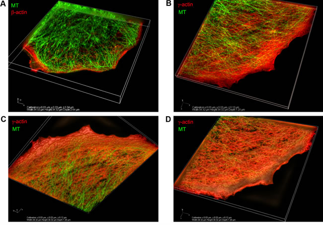Using confocal immunofluorescence microscopy we previously discovered that the two cytoplasmic actins are segregated into dorsal and ventral zones in spreading normal keratinocytes and fibroblasts [23]. Moreover, these two actin isoforms are also segregated into different cell compartments in breast cancer cells in culture, in contrast to their homogenous membranous distribution in breast cancer lesions [24]. These two actin networks with distinct structural organization were also revealed by improved STORM with dual-objectives [28]. Two vertically separated actin layers were observed in the sheet-like cell protrusion despite its thinness. We propose that these two actin layers observed by STORM in BSC-1 epithelial cells, as well as in COS-7 fibroblast-like cells, correspond to β-actin ventral bundles and the γ-actin dorsal cortical network. Here we report that the radial microtubule system is localized between the two vertically separated layers of actin. The imaging capability of 3D-SIM did not allow us to observe individual filaments of cytoplasmic γ-actin in the cortical network, but the difference in localization of β- and γ-actin systems of microfilaments in relation to microtubules was observed. 3D microtubule arrays were located in close proximity to the cytoplasmic γ-actin cortical network.