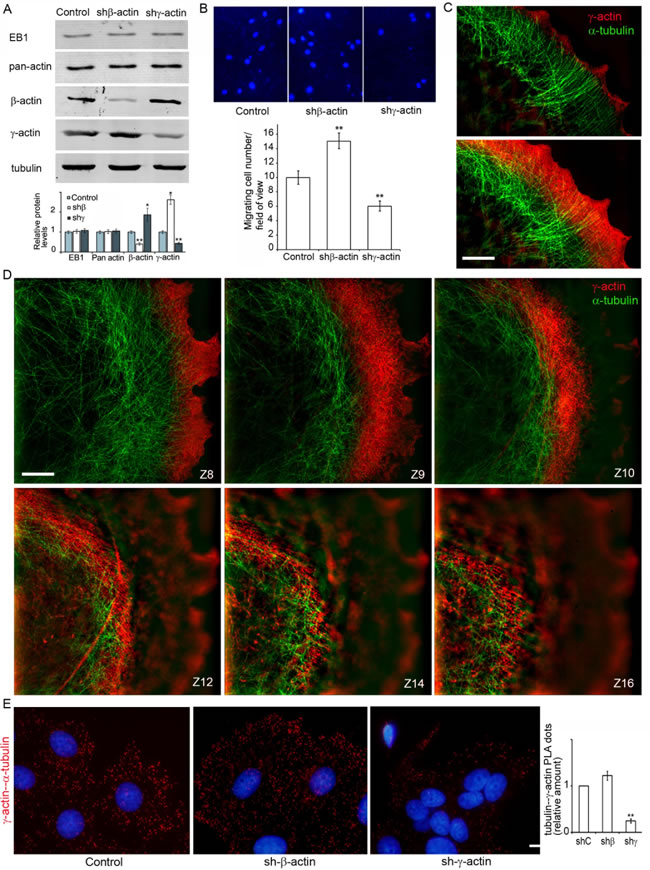Figure 4: γ-actin-microtubule interaction after actin isoform down-regulation. A. Down-regulation of cytoplasmic actins in MCF7 cells. WB analysis. B. Migratory activity of MCF7 cells with down-regulated β- or γ-actins. DAPI staining (upper panel) and quantification (Mean ± SEM; lower panel) of migrating cells. C., D. Close distribution of microtubules and the γ-actin network at the leading edge (C, D) and in the cortex (D). All panels represent galleries of optical sections taken with 0.12 µm step from the ventral to the dorsal side of the lamella (C) or of the cell (D), SIM. Bars, 5 µm. E. γ-actin/α-tubulin PLA analysis of MCF7 cells with down-regulated β- or γ-actins. Graph represents relative amounts of PLA dots (Mean ± SEM). Bar 10 µm.