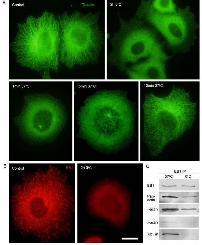 Figure 8: Interaction of EB1 with microtubules and the cytoplasmic γ-actin isoform in different conditions of tubulin polymerization. A. Radial microtubule system at 37ºC, diffuse tubulin after 2h incubation at OºC. Microtubule re-assembly in 1 min, 5 min and 10 min at 37ºC after cold-induced de-polymerization. B. EB1 distribution pattern at 37ºC and after 2h incubation at OºC. C. Co-IP analysis with antibodies to EB1 at 37ºC and OºC. Bar 10 µm.
