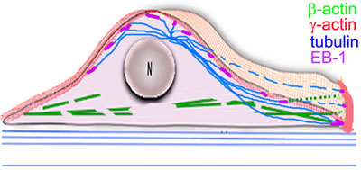 SIM and PLA analysis reveal co-localization of γ-actin and EB1 especially at the leading edge of lamella/lamellipodia. Co-IP experiments indicate that EB1 or a complex containing EB1 may interact with γ-actin, and microtubules are connected more to γ-actin, than to β-actin. Schematic presentation of our results with the radial 3D microtubule array in combination with the cytoplasmic actins is illustrated in Figure 9, where β- and γ-actins are segregated into dorsal and ventral compartments, respectively. This distribution is observed in all examined epithelial cell types, indicating that it represents a general feature.