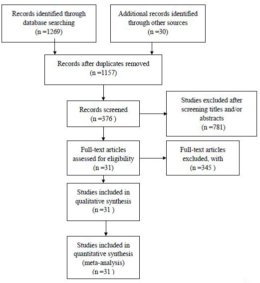 The titles and abstracts of 1157 potentially relevant articles were reviewed for initial screening (Figure 1). We then retrieved the full text of potentially eligible articles for detailed information. A total of 31 articles (Table 1) satisfied the inclusion criteria and were included in the network meta-analysis, with 8100 patients receiving at least one of the five treatments. All of the included studies had been published and were available in full manuscripts.