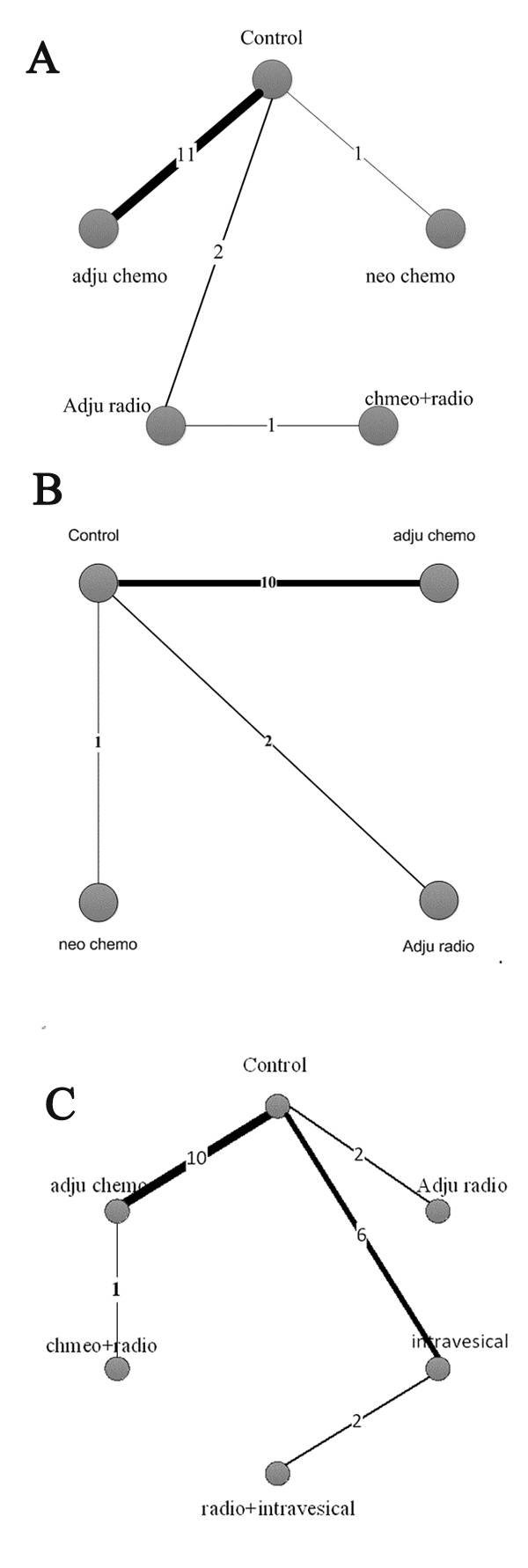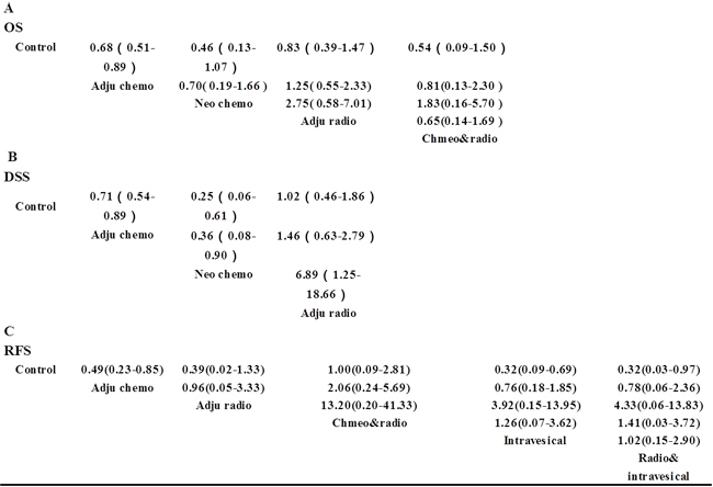 Compared with the control group, AC, intravesical chemotherapy and concurrent chemoradiotherapy were noted to improve the RFS (HR 0.49, 95% CI 0.23–0.85 for AC, HR 0.32, 95% CI 0.09–0.69 for intravesical chemotherapy and HR 0.32, 95% CI 0.03–0.97 for concurrent radiotherapy and intravesical chemotherapy). Data showed no significant difference between the various treatment strategies.
