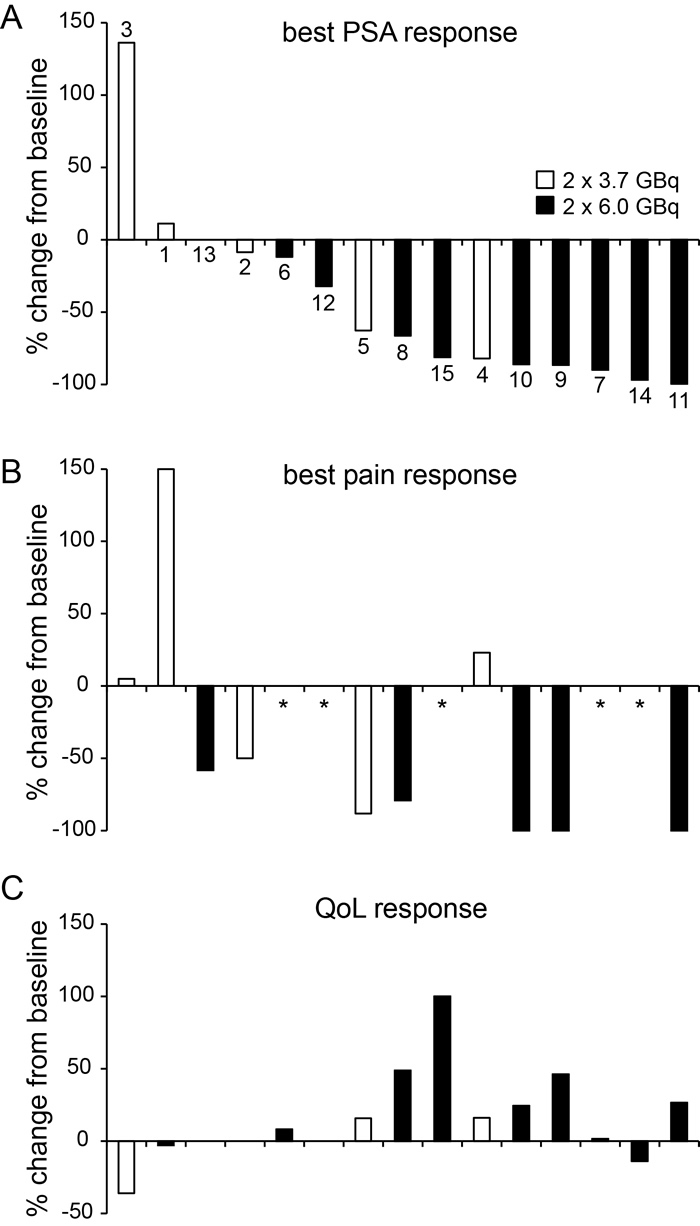Figure 3: Best response after 30 cycles of 177Lu-PSMA-617 RLT in 15 patients. Individual response by lowest PSA A., lowest pain B. and quality of life (QoL) level C. from start until follow-up after the second RLT cycle is shown. Individual results were arranged by best PSA response and separated by regimen (white bars: 2x3.7 GBq; black bars: 2x6.0 GBq). Patient number is given in (A). Bars indicate baseline to follow-up change in percent. *no baseline pain noted.