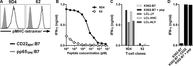 Figure 1: Identification of CD22-reactive T-cell clone 9D4 from an HLA-B7neg healthy individual. T-cell clones were isolated from HLA-B7neg healthy individuals by pMHC-tetramers composed of CD22RPF bound to HLA-B7 (CD22RPF:B7) (black), and selected for CD22 specificity. (A) Shown are histograms of two representative T-cell clones stained with specific pMHC-tetramer CD22RPF:B7 or a control pMHC-tetramer composed of pp65-derived peptide TPRVTGGGAM bound to HLA-B7 (pp65TPR:B7) (gray). (B–C) T-cell clones 9D4 and 62 were co-cultured with CD22neg K562-B7 cells exogenously loaded with peptide CD22RPF (B) or three HLA-B7pos B-LCLs naturally expressing CD22 (C) at 1:15 responder-to-stimulator ratio. (D) T-cell clone 9D4 was incubated with K562-B7 cells stably transduced to express CD22 (K562-B7 + CD22). K562-B7 loaded with peptide CD22RPF (K562-B7 + pep) served as positive control. Shown are means of one representative experiment carried out in duplicate.