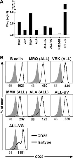 Figure 2: Recognition of B-cell malignancies by T-cell clone 9D4. (A) CD22-specific T-cell clone 9D4 was cocultured with primary HLA-B7pos acute lymphoblastic leukemia (ALL; MRQ, VBK, MMX, and ALA) or two ALL cell lines (ALL-BV and ALL-VG) at a 1:25 responder-to-stimulator ratio. CD22neg K562-B7 cells and CD22pos LCL-JY served as negative and positive control, respectively. (B) Shown are histograms of primary malignant B-cell samples and ALL cell lines stained with a CD22-specific antibody (black) or an isotype control (gray). Samples include primary ALL and ALL cell lines used to stimulate clone 9D4 in (A). Healthy B-cells served as positive control. Numbers under histograms indicate mean fluorescent intensity of respective peak.
