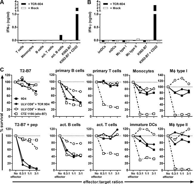 Figure 5: Off-tumor on-target toxicity of CD22-specific T cells caused by CD22 expression on dendritic cells and macrophages. CD8+ T-cells of an HLA-B7pos individual were retrovirally transduced to express either TCR-9D4 (+ TCR-9D4) or an empty vector (+ Mock). (A–B) Purified TCR- or mock-transduced CD8+ T-cells were stimulated with hematopoietic cell subsets of autologous origin. (C) Original clone 9D4, purified TCR- or mock-transduced CD8+ T-cells, or control clone CTZ were cocultured with T2-B7 cells or T2-B7 cells pulsed with peptide CD22RPF (+ pep), or hematopoietic cell subsets derived from the same origin as TCR- and mock-transduced T-cells (autologous setting). Survival of target cells was assessed after 20 hours of coculture. Shown are means of one experiment carried out in triplicate.