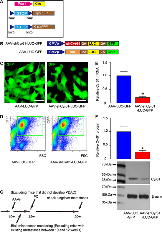 Figure 1: Schematic of in vivo experiment and AAV vectors. (A) Schematic of triple mutant male mice (Pdx1-Cre, Conditional Loxp-STOP-Loxp (LSL)-Trp53R172H/+ and LSL-KrasG12D/+). (B) Schematic of AAV virus (AAV-shCyr61-LUC-GFP and AAV-LUC-GFP). (C) A human PDAC cell line, PANC-1, was transduced with AAVs and the cells appeared green due to expression of GFP in culture. (D) To obtain purified cells, the transfected cells were further subjected to flow cytometry to isolate GFP+ cells, shown by representative flow charts. (E–F) Cyr61 levels in the purified GFP+ cells by RT-qPCR for mRNA (E) and by Western blot for protein (F). (G) Mice received intraductal infusion of AAV at 10 weeks of age. The mice were kept for 2 weeks before pancreatectomy (PX) was performed. During the 2 weeks, bioluminescence was monitored and all mice that showed bioluminescence outside pancreas region (e.g. lung and liver) were excluded from the study. At the time of PX, mice that did not develop PDAC were also excluded from the study. Afterwards, the mice received insulin pellets and were kept for another 8 weeks, before they were lively analyzed for presence of distal metastases (at liver and lung) through bioluminescence and then sacrificed to analyze presence of distal metastases through examination of the GFP mRNA levels in liver and lung. *p < 0.05. N = 20. Scale bars are 10 μm.