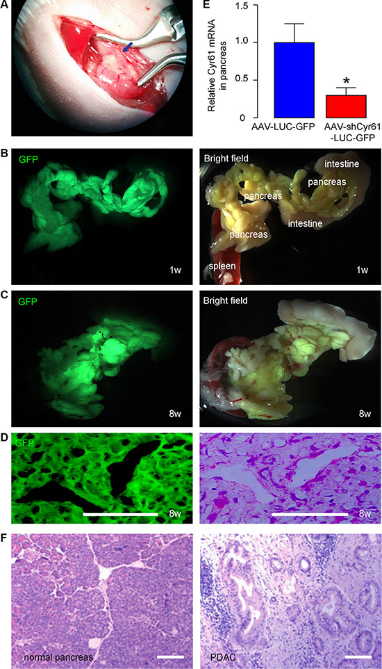 Figure 2: Quality control of intraducal infusion of AAV in mouse pancreas and examination of PDAC formation. (A) Illustration of surgical performance of intraductal infusion of the pancreas. The blue arrow points to the blunt end of the catheter inside the duct. (B–C) Representative gross images of mouse pancreas 2 days (B) and 8 weeks (C) after intraductal infusion. GFP and bright fields are shown. Anatomic markers are labeled. (D) Immunostaining for GFP on tumor tissue in pancreas section 8 weeks after AAV infusion (left panel) and H&E staining on a consecutive section (right panel). (E) RT-qPCR for Cyr61 in mouse pancreas 2 days after intraductal infusion. (F) Presence of PDAC based on H&E staining shown by representative images. *p < 0.05. N = 20. Scale bars are 50 μm.