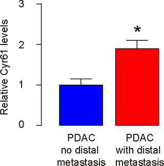 Figure 7: Higher Cyr61 levels are detected in PDAC specimens with distal metastasis. Resected PDAC specimens (all Stage III) from 35 subjects were analyzed for Cyr61 levels by RT-qPCR and the samples were grouped based presence of distal metastasis (n = 19) or not (n = 16) at the time of diagnosis. *p < 0.05.