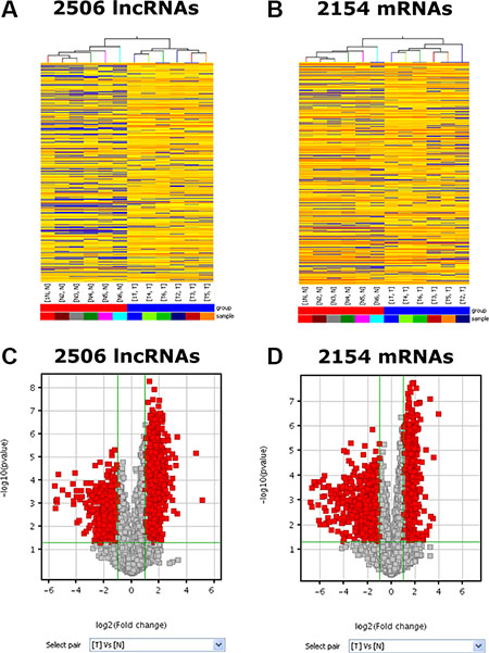 Figure 1: Differentially expressed RNA profiles between human PC tissue and paired adjacent non-tumor samples. (A, B) It shows the expression profiles of the lncRNAs and mRNAs in PC tissue and adjacent normal tissue. (C, D) The red points in the Volcano Plots represent the differentially expressed lncRNAs and mRNAs with statistical significance. The vertical lines correspond to 2.0-fold up and down and the horizontal line represents a P-value of 0.05. Data shown was averages from 6 pairs of PC specimens and adjacent non-tumor tissue.