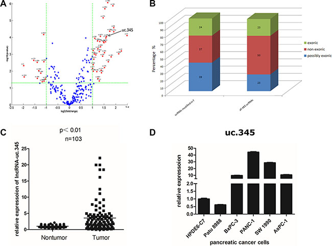 Figure 2: uc.345 is up-regulated in PC tissue. (A) Genome-wide expression profiling of the ultraconserved LncRNAs (ucRNA) was performed in pancreatic cancer tissues and normal tissues. Total of 261 ucRNAs were aberrantly expressed in PC, with 39 ucRNAs increased and 12 decreased by greater than two fold. The ratio of expression of these ucRNAs in pancreatic cancer tissues to normal tissues was plotted against the P value. Selected ucRNAs with a greater than two fold change in expression were annotated. (B) The genomic locations of the ucRNA as exonic , nonexonic, or possibly exonic relative to protein-coding genes is depicted for all ucRNAs and for the group of ucRNAs that are aberrantly expressed in pancreatic cancer tissues. (C) uc.345 is significantly up-regulated in PC tissues compared to the paired noncancerous tissues. Statistical differences were analyzed using the paired t test. Horizontal lines represent the median. (D) uc.345 is highly expressed in pancreatic cancer cells except Patu 8988, compared with normal pancreatic cells HPDE6-C7. RNA was extracted from different cell lines and uc.345 expression evaluated by quantitative real-time-PCR. The expression of uc.345 was normalized to that of RNU6B.