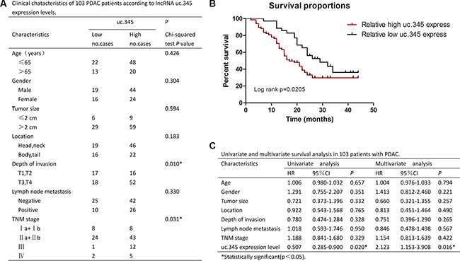 Figure 3: uc.345 is an independent prognostic factor to predict overall survival. (A) Clinical characteristics of 103 PC patients according to uc.345 expression levels. Relative expression level between tumor and normal tissues was used as the cutoff. For analysis of correlation between uc.345 levels and clinical features, Pearson’s chi-square and Fisher’s exact tests were used. (B) Kaplan-Meier’s analyses of correlations between uc.345 expression level and OS of 103 PC patients is shown (long-rank test: p = 0.0205). (C) Univariate and multivariate survival analysis in 103 patients with PC by employing the method of Cox regression.