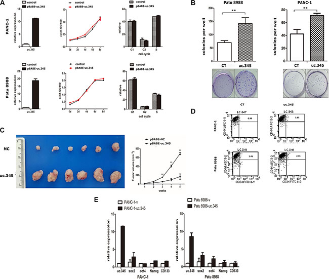 Figure 5: Overexpression of uc.345 promotes tumorigenesis of pancreatic cancer cells in vitro and in vivo. (A) PANC-1 and Patu 8988 cells are stably overexpressed uc.345. Growth curves were determined by CCK8 assays and analysis of cell-cycle distribution was performed by flow cytometry. (B) Soft agar colony-formation assays were performed to detect the effect of uc.345 on the anchorage-independent growth of PANC-1 and Patu 8988 cells. Colonies were counted after 4 wk. (C) Left: Representative images of xenograft tumors after the subcutaneous injection of PANC-1 cell stably overexpression of uc.345 or negative control. Right: Tumor volumes. P < 0.01. (D) The effect of uc.345 on cancer stem cells in PANC-1 and Patu8988 cells was determined by measuring the percentage of CD24+CD44+ positive cells using flow cytometry. (E) qRT-PCR assays were performed to detect some pluripotency-related transcriptional factors such as Oct4, Sox2, Nanog, CD133 markers expression when uc.345 are stably overexpressed in PANC-1 and Patu 8988 cells.