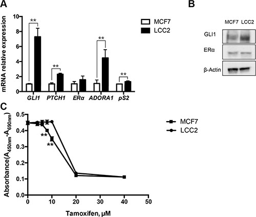 Figure 1: Characterization of tamoxifen sensitive MCF7 and tamoxifen resistant LCC2 breast cancer cells. (A) Endogenous expression of GLI1, PTCH1, ERα, ADORA1 and pS2 in MCF7 and LCC2 cells was determined by real-time PCR. Data are represented as relative expression (2−ΔΔCt values), calculated by subtracting the Ct value of the housekeeping gene TBP from the Ct value of the interrogated transcripts (ΔCt), and normalized to the ΔCt values obtained with MCF7. Representative data from one of three independent experiments are shown. Error bars indicate the standard deviation. **, Statistical significant, P < 0.01, compared to control, calculated by the Student’s t-test. (B) Protein levels of GLI1, ERα and β-Actin in MCF7 and LCC2 cells were analyzed by Western blot. β-Actin was used as the endogenous protein control. (C) The effects of tamoxifen on cell viability. MCF7 and LCC2 cells were treated with 0, 4, 6, 8, 10, 20 or 40 μM tamoxifen and after 48 hours cell viability was determined with the WST-1 assay. The absorbance at 450 nm was measured with the reference wavelength set at 690 nm. Shown are data from triplicate measurements. Representative data from one of three independent experiments are shown. Error bars indicate the standard deviation. The two-way ANOVA analysis using Sidak’s multiple comparisons was employed to calculate statistical significance (**P < 0.01).